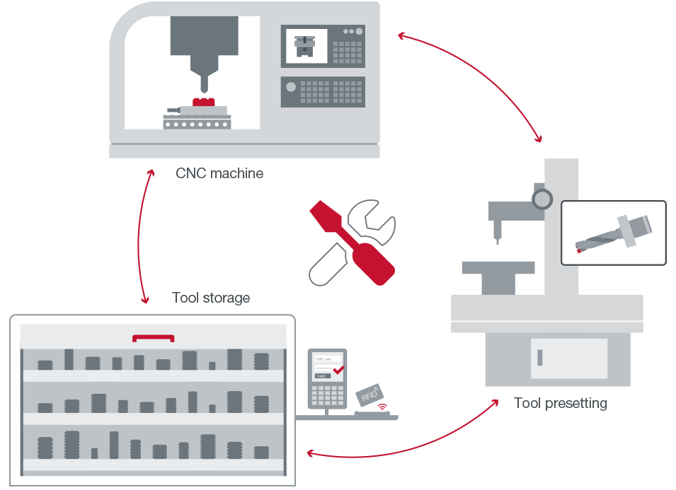 After tool measurement, the tool correction data is either written on a tool chip, or the data is saved in SAP and then handed over to the machine.